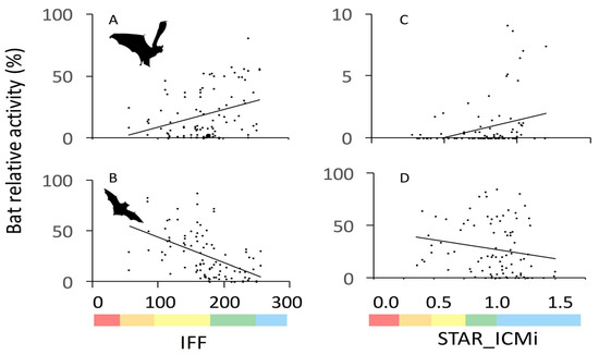 In that study too, bat activity was measured acoustically. Higher activity levels were recorded for some species as the values of quality indices increased, while the activity of other species declined; thus, [18] opportunistically pooled together species showing the same trends, which strengthened the indication performances. These results are encouraging; however, as for the others mentioned above, locally adapted bat populations might show different responses in other geographic regions, so the findings of this study warrant confirmation over a broader geographic range.