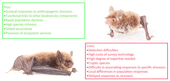 Such criteria are therefore a mix of intrinsic features of bat natural history, their correlation with anthropogenic stressors, and practical sampling aspects. While this analysis provides a general picture of the potential value of bats as bioindicators, some of these aspects, as well others, merit further discussion, especially in light of new knowledge on bat biology, ecology, and technology applied to sampling.