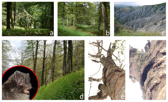 Barbastelle bats (Barbastella barbastellus), often deemed forest bats typically associated with unmanaged forest (a), may in fact occur in logged sites (b) or even in clay badlands (c) characterised by few or no trees. The species is sensitive to multiple spatial scales, from landscape/habitat (d) to tree (e) and cavity (f) types. In (f), a small reproductive group can be noticed roosting underneath the flaking bark of a beech snag.