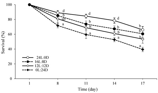 Comparison of survival rate of B. orientalis under different photoperiod regimes (mean ± SD, n = 3). Different superscript letters denote statistically significant differences at each timepoint (p < 0.05).