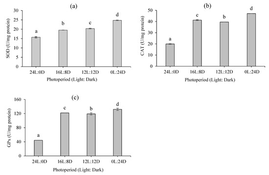 The effects of different photoperiods on the antioxidant status of fairy shrimp are depicted in Figure 4a–c. The highest and lowest antioxidant enzyme activities, including superoxide dismutase (SOD, Figure 4a), catalase (CAT, Figure 4b), and glutathione peroxidase (GPx, Figure 4c), were observed at 0L:24D and 24L:0D, respectively (p < 0.05). However, no significant differences were detected between the 16L:08D and 12L:12D photoperiods regarding such enzyme activity (p > 0.05).