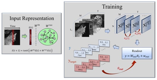 To adapt this architecture—usually employed in time-series analyses—for image classification tasks, we used black and white images with pixels (each of them characterized by a value in the interval, representing a normalized grey-scale) and converted them into multivariate time series by considering their vertical dimension as a vector of elements or features, that “evolve” along discrete “time” steps. One can then define a standard training protocol in which, as illustrated in Figure 1, at each time , vectors corresponding to columns of a given image are fed as inputs to the ESN. In this way, the network dynamics for the reservoir states is given by the following non-linear activation function: