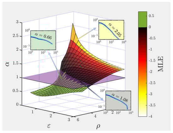 where is termed the maximum Lyapunov exponent (MLE), is the initial distance between the perturbed and unperturbed trajectories, and is the distance between the trajectories at step k (we refer the reader to [43,44] for a detailed explanation of the algorithm used to compute the MLE). Thus, chaotic dynamics are typically associated with a positive MLE, while the system is said to be stable to local perturbations provided . It can be clearly seen from Figure 2 that the region in which one finds non-C+D representations of the input (below the purple plane) matches almost perfectly with the region (colored in green) in which a positive MLE is found.