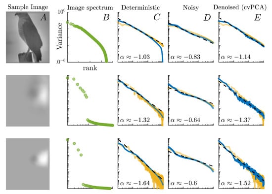 From left to right: (A) sample from the images in the training set; (B) eigenspectrum of the images pixel intensities; (C) eigenspectrum for the activities of an echo state network (blue line) and actual, V1 mouse neurons (yellow line, plotted after [20] applying cross-validated PCA; see Materials and Methods) when subject to images of dimensionality d; (D) same analysis, but now zero-centered white noise of amplitude is added to the neuron dynamics (blue line), and no cvPCA is performed over the experimental values (yellow line); (E) same analysis as in (D), but now noise has been subtracted using cvPCA. From top to bottom: results for natural, high-dimensional images; the same images projected onto 8 dimensions; the same images projected onto 4 dimensions. To obtain the ESNs eigenspectra, parameters were chosen so that the networks operated near the edge of chaos, with .