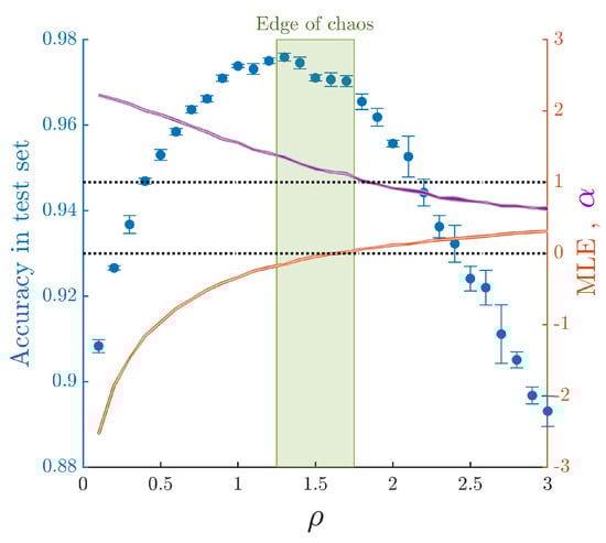We finally remark that these results were obtained with a reservoir consisting only of 500 internal units and using only one-third of the training set, with no pre-processing of the images. In contrast, the current best performance in MNIST digit recognition ( error rate) using reservoir computing networks has been achieved with a two-layer architecture, each consisting of 16,000 units, which amounts to a total of 880,000 trainable parameters [54]. In this sense, when compared to ESNs with a greater number of units and much more complicated dynamics trained over the full MNIST dataset [49], our simple ESN with readouts over the reservoir model space shows comparable performance when tuned near the edge of chaos.