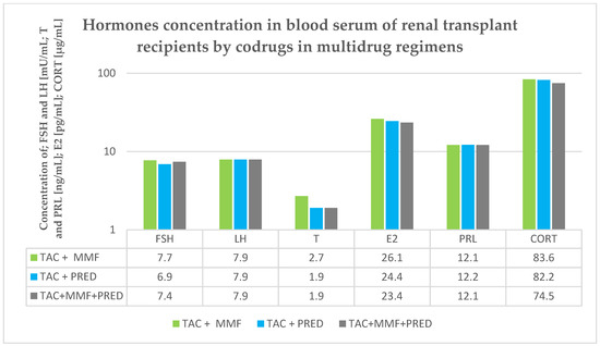 It is believed that after successful KT, an impairment in HPGA may be recovered, however, it is still unclear to what extent it proceeds. According to the literature, it is impossible to predict the future gonadal function in RTR [5]. The effects of the intake of TAC are still controversial, therefore the aim of the current study was to investigate the influence of multidrug IT based on TAC on the concentrations of sex hormones profile in serum of RTR, including: LH, FSH, PRL, T, E2, cortisol (CORT) by sex, age and codrugs likewise MMF, PRED.
