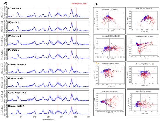 Raman spectroscopy of erythrocytes in PD. (A) Raman spectroscopy on the blood samples showed overall similar peaks constituting the spectrum, however internal variance in PD samples can be seen, which might be due to the disease-specific heterogeneity of single red blood cells. (B) Principal component analysis (PCA) clearly demonstrated that the Raman signal intensity at 1260 and 1545 cm−1 had the biggest correlation to the patient’s disease status.
