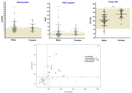 Evaluation of plasma homocysteine, PAP and factor XIII levels. Plots (upper section) showing values for PAP , homocysteine and factor XIII levels in PD patients. Dark bars illustrate the minimum to maximum range of levels for these markers in healthy populations. Three groups of patients with altered PAP or homocysteine levels are shown in the lower section. p-values < 0.05 were considered significant differences and are marked. (*** p < 0.001)