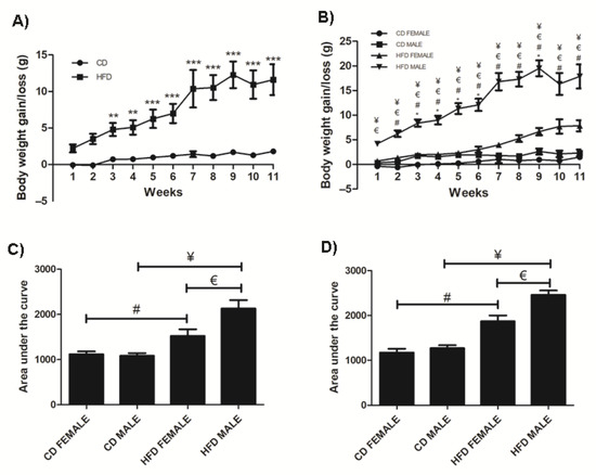 Weight gained in CD and HFD animals over the 11-week period. HFD animals gained significantly more weight than CD animals, (A). HFD females and males gained significantly more weight than CD females and males, respectively. Additionally, HFD males gained significantly more weight than HFD females, (B). The area under the curve for a glucose tolerance test conducted at week 3, (C) and week 9, (D) showed HFD males and females displayed glucose intolerance, which was greater in the HFD males. Key: ** Significant difference between CD and HFD animals, p < 0.05. *** Significant difference between CD and HFD animals, p < 0.001.* Significant difference between CD male and CD female, p < 0.05. # Significant difference between CD female and HFD female, p < 0.05. ¥ Significant difference between CD male and HFD male, p < 0.05. € Significant difference between HFD female and HFD male, p < 0.05.
