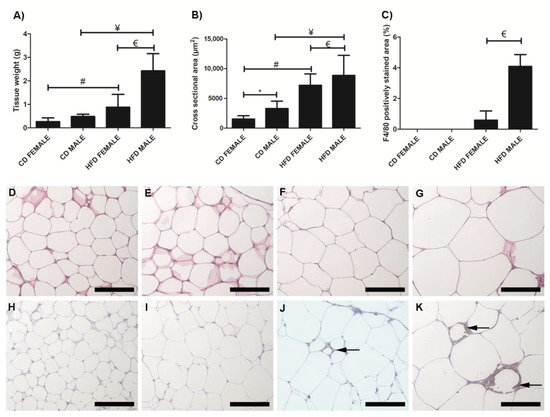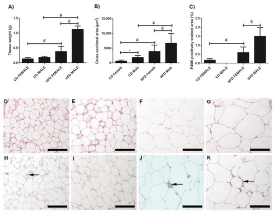 Histology and immunohistochemistry of iWAT sections. Weight of iWAT sections, (A); cross sectional area of adipocytes, (B); and F4/80+ macrophage-stained area, (C). Histological sections showing adipocyte sizes in CD females, (D); CD males, (E); HFD females, (F); and HFD males, (G). Adipocyte hypertrophy was evident in HFD males and females, compared to the CD males and females. F4/80+ immunostained sections from the CD females, (H); CD males, (I); HFD females, (J); and HFD males, (K). Macrophage infiltration (black arrow) was evident in CD females, (H); HFD females, (J); and HFD males, (K). No macrophages were observed in CD males, (I). Significantly greater macrophage infiltration was observed in HFD animals. * Significant difference between CD females and CD males, p < 0.05. # Significant difference between CD female and HFD female, p < 0.05. ¥ Significant difference between CD male and HFD male p < 0.05. € Significant difference between HFD female and HFD male, p < 0.05. Mean ± SD. Scale bar: 100 µm.