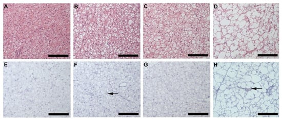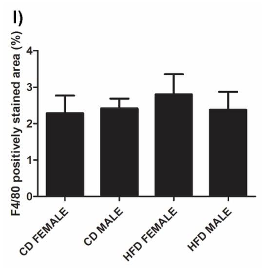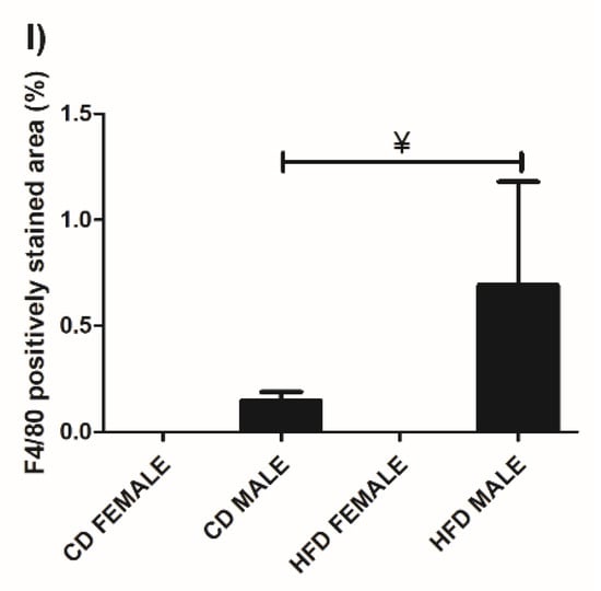 Microvesicular liver steatosis presenting as small lipid vacuoles (black arrow) lying within the hepatocytes (Figure 5A–D) was evident in the liver of HFD females (Figure 5C) and males (Figure 5D), but not in CD females (Figure 5A) and males (Figure 5B). In the HFD group, the males presented with a greater degree of steatosis, with larger lipid vacuoles (white arrow) diffused throughout the sections (Figure 5D). The presence of macrophages was observed in all animals, CD females (Figure 5E), CD males (Figure 5F), HFD females (Figure 5G) and HFD males (Figure 5H) with no significant difference observed across all the experimental groups (Figure 5I).