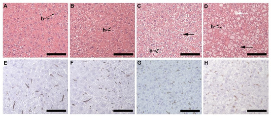 Histology and immunohistochemistry of liver tissues. Histology of liver sections harvested from CD females, (A); CD males, (B); HFD females, (C); and HFD males, (D). Microvesicular steatosis (black arrow) characterized by the accumulation of lipid droplets in the hepatocytes (h) was evident in the HFD animals (C,D), more prominently in the HFD males (D) with larger lipid vacuoles (white arrow) present. F4/80+ immunostained sections from the CD females, (E); CD males, (F); HFD females, (G); and HFD males, (H); showed positive staining (black arrow) in all groups, with no significant difference being observed; (I). Mean ± SD. Scale bar: 100 µm.