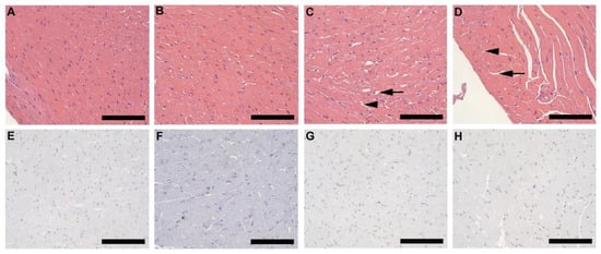 Alterations such as partial enlargement of myocardial fibers and of surrounding fibrocollagenous tissue (black arrow), as well as visible lipid droplets (arrowhead) lying between the myocardial fibers was evident in both HFD females (Figure 6C) and males (Figure 6D), but not in CD females (Figure 6A) and males (Figure 6B). The alterations observed in HFD animals was greater in males than females. No macrophages were detected in any of the experimental groups (Figure 6E–H).