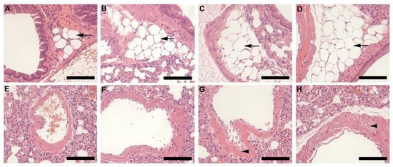 Histology of lung tissue harvested from animals on CD and HFD. CD females, (A); CD males, (B); HFD females, (C); and HFD males, (D); illustrates the pulmonary vasculature (bronchiole, pulmonary artery, or vein) surrounding adipocytes (black arrow). Adipocytes were larger and more prominent in the HFD groups (C,D) than CD (A,B). The pulmonary artery of CD females, (E); CD males, (F); HFD females, (G); and HFD females, (H); shows lipid accumulation (arrowhead) in the smooth muscle layer, which was evident in the HFD groups (G,H), particularly in HFD males, (H). Scale bar: 100 µm.