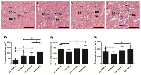 Kidney tissues from CD females (Figure 8A), CD males (Figure 8B), HFD females (Figure 8C) and HFD males (Figure 8D) showed significant enlargement of the Bowman’s space (Figure 8E) in both HFD females (p < 0.0001) and HFD males (p = 0.0009), while significant enlargement of the glomerular area (p = 0.033; Figure 8F) and Bowman’s capsule (p < 0.0001; Figure 8G) was only evident in HFD males. Lipid accumulation in the lining and wall of the renal tubules (black arrow) was clearly visible in HFD males (Figure 8D). It was also noted that CD females displayed a significantly larger glomerular area (p = 0.0261; Figure 8F) and Bowman’s capsule (p = 0.0041; Figure 8G) compared to CD males, while CD males displayed a significantly larger (p < 0.0001) Bowman’s space compared to CD females.