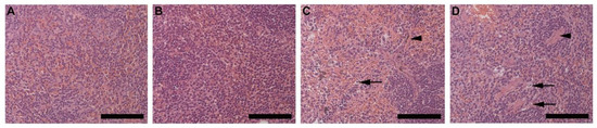 Histology of the spleen harvested from CD females, (A); CD males, (B); HFD females, (C); and HFD males, (D) showing the red pulp of the spleen, consisting of the parenchyma and surrounding sinusoids. HFD females, C and males, D displayed cell swelling and necrosis (black arrow), and visible fibrotic lesions (arrowhead). The fibrotic lesions were more prominent and larger in the HFD males. Scale bar: 100 µm.