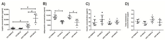Plasma leptin concentration (pg/mL), (A); plasma adiponectin concentration (ng/mL), (B); plasma insulin concentration (pg/mL), (C); and total cholesterol (µg/µL), (D); measured in CD females, CD males, HFD females and HFD males. * Significant difference between the CD females and CD males, p < 0.05. # Significant difference between CD female and HFD female, p < 0.05. ¥ Significant difference between CD male and HFD male p < 0.05. € Significant difference between HFD female and HFD male, p < 0.05. Mean ± SD. Black circle, triangle and square represent individual data points in the different categories CD females, CD males, HFD females and HFD males on the x-axis.