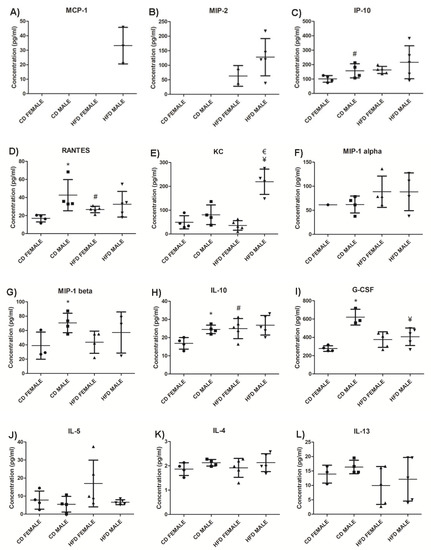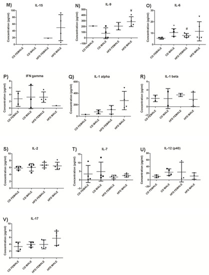 Chemokines, anti-inflammatory and pro-inflammatory cytokines levels in HFD and CD animals. MCP-1, (A); MIP-2, (B); IP10, (C); RANTES, (D); KC, (E); MIP-1α, (F); MIP-1β, (G); IL-10, (H); G-CSF, (I); IL-5, (J); IL-4, (K); IL-13, (L); IL-15, (M); IL-9, (N); IL-6, (O); IFN-γ, (P); IL-1α, (Q); IL-1β, (R); IL-2, (S); IL-7, (T); IL-12 (p40), (U); and IL-17, (V). The graphs display the cytokines measured in CD females, CD males, HFD females and HFD males. * Significant difference between the CD females and CD males, p < 0.05. # Significant difference between CD female and HFD female, p < 0.05. ¥ Significant difference between CD male and HFD male p < 0.05. € Significant difference between HFD female and HFD male, p < 0.05. Mean ± SD. Black circle, triangle and square represent individual data points in the different categories CD females, CD males, HFD females and HFD males on the x-axis.