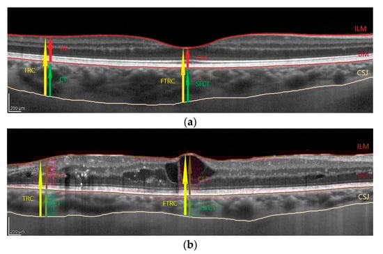 The major part of the choroid are vessels organised in three vascular layers. The choriocapillaris, a thin capillary network, is the innermost layer, the medium- and small-sized vessels form the intermediate Sattler’s layer, and the large vessels form the outermost Haller’s layer. The suprachoroid separates the latter layer from the sclera [10]. CVI reflects the vascularity of the choroid [28,39]. To calculate CVI, choroidal areas on OCT scans were binarised with a modified Niblack method, as described by Sonoda et al. [29,40]. Briefly, the entire horizontal scan (6 mm) across the fovea was assessed, with the BM as the upper margin and the choroidal-scleral junction as the lower margin. Binarisation and segmentation of the images were done with ImageJ software (http://imagej.nih.gov/ij (accessed on 6 April 2020), version 1.49). LA, stromal area (SA), and TCA were calculated, and the CVI was determined as the LA to TCA ratio.
