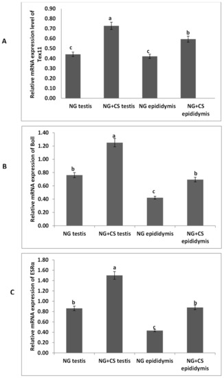 Expression analysis of TEX11, BOLL, and ESRα mRNA using qPCR: (A) TEX11, (B) BOLL, (C) ESRα mRNA. NG = natural grazing without concentrate supplementation group, NG + CS = natural grazing plus concentrate supplementation group. Different letters indicate a significant difference (p < 0.05).