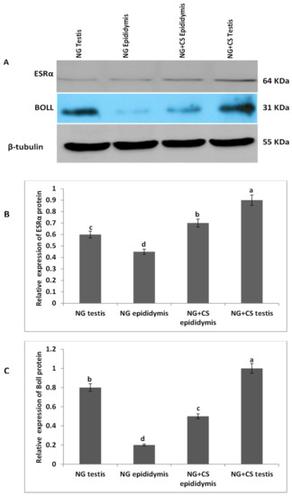 Additionally, Western blotting was performed to evaluate ESRα and BOLL proteins in the testis and epididymis of Datong yaks with and without concentrate supplementation (Figure 2). Our Western blot results indicated that the expression of both proteins increased after concentrate supplementation. Moreover, ESRα protein was lower in the testes and epididymis of the group without concentrate supplementation than in the NG + CS group. Similarly, expression of BOLL protein was higher in the testes and epididymis of the NG + CS group, and lower expression was observed in the epididymis of the control group.
