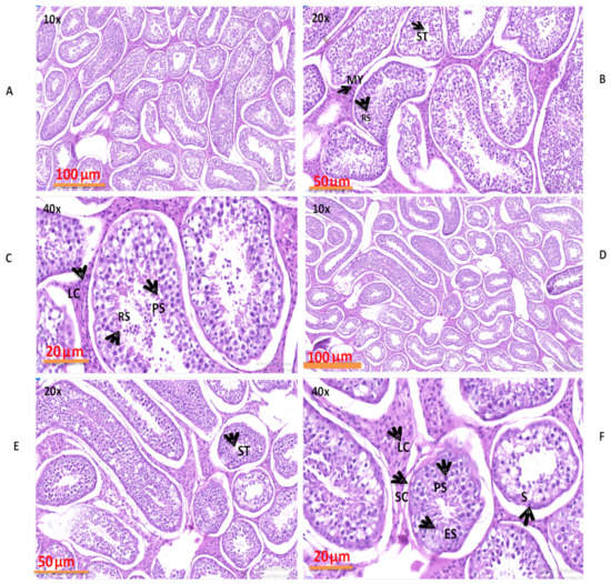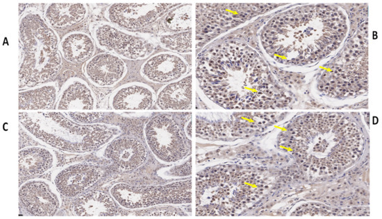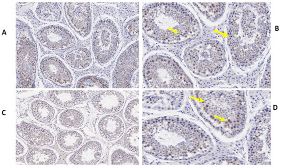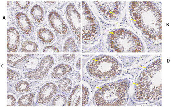Immunohistochemical staining protocols for TEX11, ESRα, and BOLL proteins from previous studies were followed [34,35]. The testicles were deparaffinized and PBS was used to wash the slides to avoid any further endogenous peroxidase development. Tissue sections were treated at 37 °C for 15 min with 3% hydrogen peroxide in PBS. Slides were then blocked at ambient temperature for 1 h in 5% serum in PBS and incubated at 4 °C with anti-TEX11, anti-ESRα, and anti-BOLL antibodies (1:500 dilution; Abcam, Cambridge, UK) overnight. The slides were incubated at room temperature with HRP-conjugated anti-rabbit secondary antibody for 1 h after washing with PBS. Finally, images were taken using a microscope (Leica, Germany).