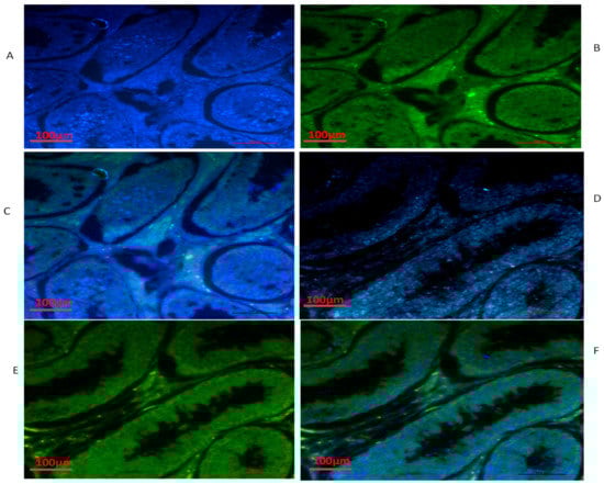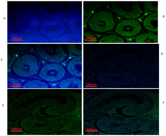 Briefly, slides of deparaffinized tissues were incubated overnight at 4 °C with primary antibodies against TEX11, ESRα, and BOLL. Slides were subsequently washed in PBS, an analogous secondary antibody was added, and segments were incubated at 37 °C for 2 h. The segments were then washed again with PBS and diamino-2-phenylidole was used for nuclear staining. Finally, photos were taken using an Olympus microscope (BX53) and a camera (Olympus DP73, Olympus Corporation Company, Tokyo, Japan).