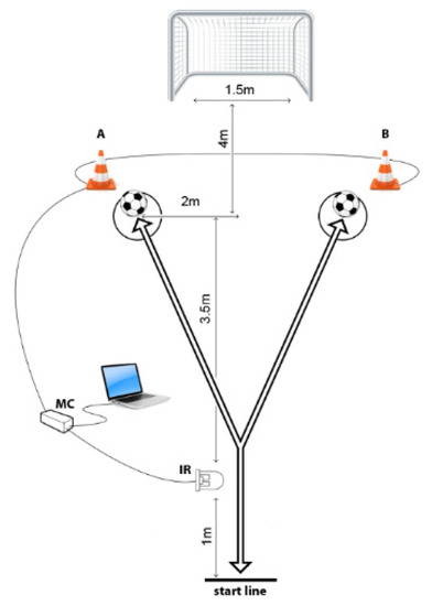The soccer-CODS, and soccer-AGIL were tested with specifically designed tests. An infrared (IR) sensor was used as input for time triggering, and LEDs placed in the cones were set as outputs. The cones were shaping a Y pattern. The first cone was placed at the start line, and in that cone, IR sensor was placed. The other two cones were placed 4.5 m diagonal from the starting cone. For both tests, players had to run from the start line, switching the IR sensor, which triggered one of the lighting cones, and when the timing began. They had to run to the lit cone, kick the ball placed in front of that cone and run back to the start line when the time was recorded. For soccer-AGIL, the players did not know which cone would be lit, whereas, for the soccer-CODS, they knew the testing scenario in advance. For soccer-AGIL, the players performed five trials; for soccer-CODS, they performed two trials. The best results were used in the analysis for both soccer-CODS and soccer-AGIL [29] (Figure 1).