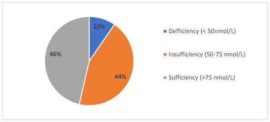 Figure 2 presents the distribution of vitamin D sufficiency, insufficiency, and deficiency in youth players from southern Croatia, at the end of the winter period. In brief, 46.4% of players had sufficient levels of vitamin D (20(OH)D > 75 nmol/L), the vitamin D insufficiency (25(OH)D levels of 50–75 nmol/L) was evidenced in 44% of players, while 9.6% of studies players had vitamin D deficiency (25(OH)D < 50 nmol/L). The mean value for the 25(OH)D level was 79.03 nmol/L (standard deviation of 25.32), while median value was 73.55 nmol/L.