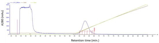 Affibody–MMAE conjugation was obtained according to the method described in Sochaj-Gregorczyk et al. [21]. After the conjugation reaction, the mixture was analyzed by HIC-HPLC. This chromatography allowed us to separate unconjugated proteins from the affibody conjugated to the hydrophobic auristatin E. The HPLC chromatogram described by Sochaj-Gregorczyk et al. confirmed the presence of a peak corresponding to ZHER2:2891DCS conjugated with MMAE [21].