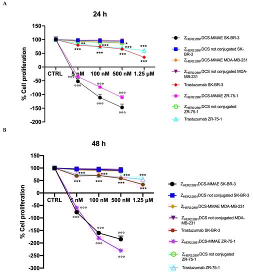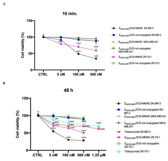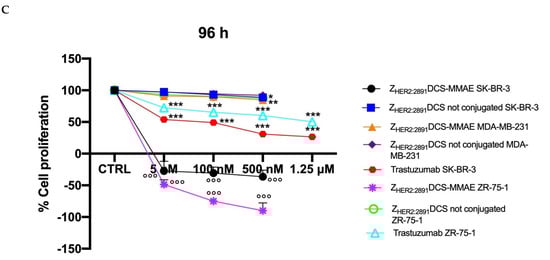 Since trastuzumab is used in patients with HER2-overexpressing metastatic breast cancer, we decided to use it as a reference compound. Therefore, we incubated both SK-BR-3 and ZR-75-1 cells with increasing concentrations of trastuzumab. As shown in Figure 4B,C, at all time points and concentrations tested, trastuzumab showed a lower cytotoxic effect on these cell lines compared to ZHER2:2891DCS-MMAE. Of note, not even at the additional higher concentration tested with trastuzumab (1.25 µM) cell viability was reduced up to at least 50%.
