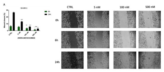 Next, we evaluated whether ZHER2:2891DCS-MMAE treatment would affect SK-BR-3 and MDA-MB-231 cell motility. A low percentage of serum (0.4% of FBS) was used to minimize cell proliferation. The results of the wound healing experiments show that ZHER2:2891DCS-MMAE did not significantly affect the wound reclosure after 6 h (Figure 6A). On the contrary, after 24 h of treatment, ZHER2:2891DCS-MMAE significantly inhibited SK-BR-3 cell migration in a concentration-dependent manner compared with the untreated cells. After 48 and 72 h of incubation, cells were partially detached from the well surface, which made it impossible to measure the wounded area at these time-points (Data not shown).