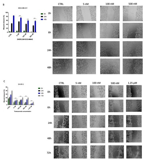 As shown in Figure 6C, the migration rate of SK-BR-3 cells was significantly inhibited compared to the control by trastuzumab at all concentrations tested, ranging from 5 nM to 1.25 µM.