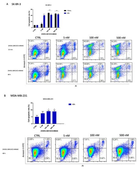 Cell apoptosis was performed using an Annexin V-FITC Apoptosis Detection kit (Sigma-Aldrich) according to the manufacturer instructions. Briefly, SK-BR-3 and MDA-MB-231 were seeded in 24-well plates and grown to confluence. Cells were then treated for 10 min followed by drug removal and an additional 48 h of incubation in medium alone or for 48 h of continuous exposure to ZHER2:2891DCS-MMAE (5–500 nM) and trastuzumab (5 Nm–1.25 µM). Next, cells were washed with PBS, resuspended in 300 µL of binding buffer (25 mM CaCl2, 1.4 M NaCl, and 100 mM HEPES/NaOH, pH 7.5), and incubated in the dark for 10 min with 5 µL of Annexin V-FITC conjugate and 10 µL of Propidium Iodide (PI). The percentage of apoptotic cells was evaluated with a flow cytometer (ACEA Biosciences NovoCyte, San Diego, CA, USA)