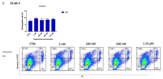 As shown by the MTT assay and cell apoptosis analysis, our reference compound, trastuzumab, displayed only a low cytotoxic effect in SK-BR-3 and ZR-75-1 cells compared to ZHER2:2891DCS-MMAE. Consistently, Abdollahpour-Alitappeh et al. showed that different concentrations of trastuzumab (from 1 to 1000 ng/mL) exhibited only a weak cytotoxic effect in SK-BR-3 cells [40].