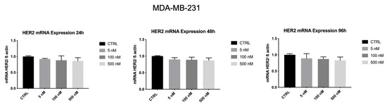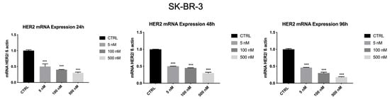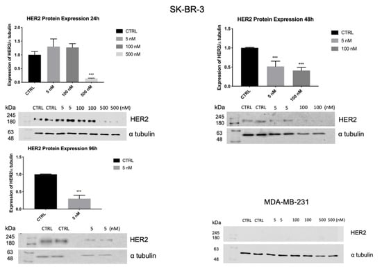HER2 expression in SK-BR-3 and MDA-MB-231 cell lines. SK-BR-3 were treated for 24, 48, and 96 h, while MDA-MB-231 were treated for 24 h. HER2 expression was measured by Western blot analysis and α tubulin was used as a loading control. The p-value was determined by one-way ANOVA test with Dunnett post hoc test and considered significant for p < 0.001 *** compared to control. Data are presented as mean ± SEM. The complete western blots are shown in Supplementary Figures S1 and S2.