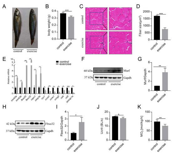 Excessive exercise causes skeletal muscle atrophy in zebrafish. (A) Representative image of excessive exercise and control zebrafish. (B) Changes in the body weight of zebrafish with or without excessive exercise over a 4-week period. (C) Representative photomicrographs of muscle sections stained with H&E. Scale bars = 20 μm. (D) Average fiber size (based on H&E staining). (E) The expression of muscle-atrophy-related genes (trim63a, trim63b, fbxo25, fbxo32, capn1, and casp3a), cyclin (ccnd1, ccne1, and ccng2), mitochondrial function markers (cyc1, nd4, and nd5), and ppargc1a in muscle tissue detected using real-time PCR. (F–I) Western blot analysis of Murf and Fbox32 proteins (representative blot). All uncut western blot images are provided in Supplementary Materials. Data represent mean ± SD (n = 6). (J,K) The critical swimming speed (Ucrit) and oxygen consumption (MO2) were measured using the Loligo System. * p < 0.05, ** p < 0.01, and *** p < 0.001.