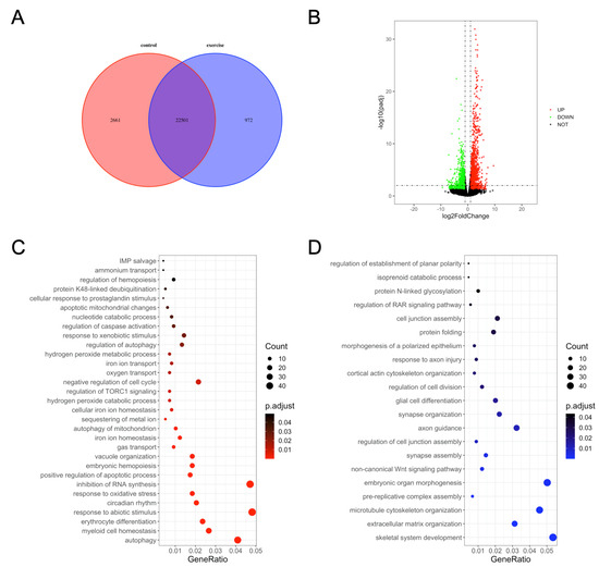 Gene ontology (GO) enrichment analysis of differentially expressed genes in zebrafish skeletal muscles. (A) Venn diagram of the total number of identified genes. (B) Volcano plot constructed using fold change values and Padj value. Red: upregulated, green: downregulated, gray: nonsignificant. (C) GO terms enriched in upregulated genes. (D) GO terms enriched in downregulated genes.