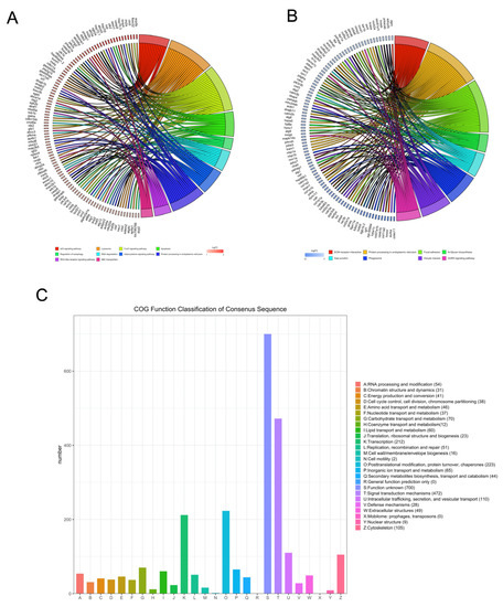 Kyoto encyclopedia of genes and genomes and clusters of orthologous groups (COGs) analysis of DEGs. The David online database and ‘clusterProfiler’ package in R were used to analyze the gene ontology (GO) terms associated with upregulated DEGs (A) and the GO terms associated with downregulated DEGs (B). (C) The BioMart package and COG database were used to obtain the COG assignments of the DEGs. The vertical axis represents the number of DEGs in each category, and the horizontal axis represents the COG functional category.