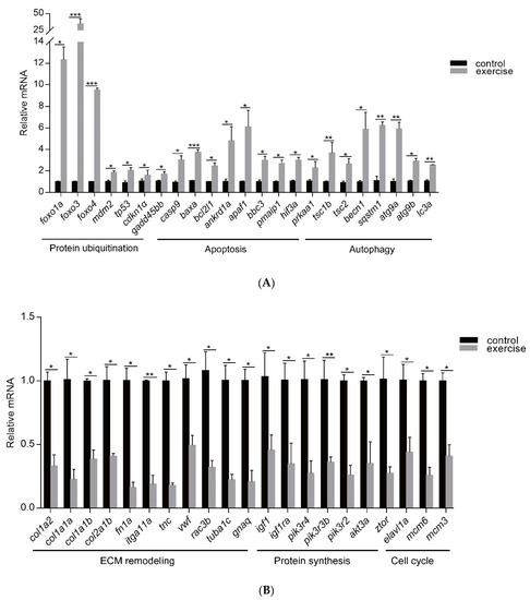 qRT-PCR was used to quantify key genes related to muscle atrophy caused by excessive exercise. (A) Upregulated genes. (B) Downregulated genes. The data represent mean ± SD (n = 6). * p < 0.05, ** p < 0.01, and *** p < 0.001.