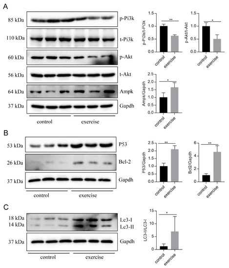 Western blot was used to validate key proteins in signals involved in excessive-exercise-induced muscle atrophy. (A) The expression of proteins in the PI3K–AKT signal (representative blot). (B) The expression of proteins in the apoptosis signal (representative blot). (C) The expression of proteins in the autophagy signal (representative blot). Right panels are quantitative analysis data of the protein expression level by Image J and GraphPad Prism. All uncut Western blot images are provided in Supplementary Materials. Data represent mean ± SD (n = 6). * p < 0.05, ** p < 0.01.