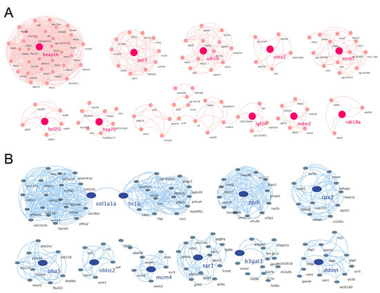 The PPI networks of the upregulated and downregulated genes were generated using the STRING database and Cytoscape software (Figure S1A,B), and the top 10 clusters in the PPI networks were generated using the MCODE extension (Figure 6A,B). The genes keap1b, per3, ulk1b, socs2, esrp1, bcl2l1, hsp70, igf2r, mdm2, and rab18a were the hub genes in the clusters of the PPI network of upregulated genes with the highest fold change. Similarly, col1a1a, fn1a, ppih, tpx2, uba5, nhlrc2, mcm4, tac1, b3gat3, and ddost were the hub genes in the clusters of the PPI network of downregulated genes (Table 1). Finally, we performed an additional round of GO enrichment analysis on the proteins in the PPI network. The 10 representative biological process GO terms are listed in Table 2. We found that most of the upregulated genes were involved in protein ubiquitination, circadian regulation of gene expression, response to abiotic stimulus, response to hydrogen peroxide, erythrocyte homeostasis, ADP metabolic process, negative regulation of the biosynthetic process, embryonic hemopoiesis, proteasome-mediated ubiquitin-dependent protein catabolic process, and autophagy. The most downregulated genes were involved in the ECM organization, skeletal system development, axon guidance, regulation of the retinoic acid receptor signaling pathway, noncanonical Wnt signaling pathway, glycoprotein biosynthetic process, carbohydrate derivative biosynthetic process, retinoic acid metabolic process, glial cell differentiation, and cellular hormone metabolic process.