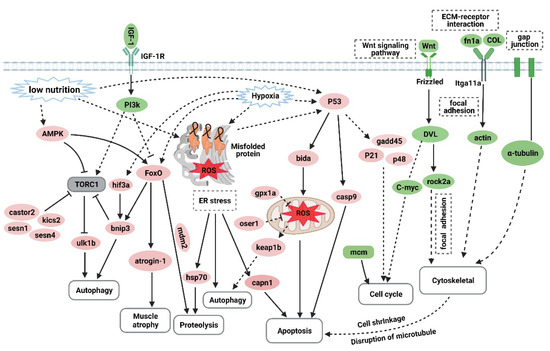 The hypothetical pathogenesis mechanism of muscle atrophy induced by excessive exercise in zebrafish. The upregulated genes are shown in red ovals, and the downregulated genes are shown in green ovals. In response to excessive exercise, the muscle cells may undergo the following events: (1) the inhibition of IGF–PI3K signaling and upregulation of AMPK inhibit the function of the TORC1 complex to suppress protein synthesis and promote autophagy; (2) excessive exercise activates FoxO signaling, which promotes the expression of protein hydrolysis, autophagy, and muscle-atrophy-related gene expression; (3) excessive exercise induces oxidative stress, and the accumulation of misfolded proteins in the endoplasmic reticulum and the activation of p53 signaling lead to proteolysis, autophagy, and apoptosis; (4) overtraining inhibits Wnt signaling and the expression of the MCM complex, which suppresses the proliferation of muscle satellites; and (5) excessive exercise destroys ECM–receptor interaction, focal adhesion, and the gap junction of muscle cells, leading to cytoskeleton damage and inducing apoptosis. (Created with BioRender.com.)