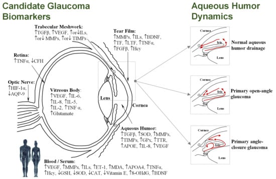 (Left): Diagram of the human eye in horizontal section showing the main structures and the most frequently cited biomarkers identified in the different tissues and/or fluids (see Tables 1–4); Upward-pointing arrows indicate higher levels in glaucoma; Downward-pointing arrows indicate lower levels in glaucoma; Simultaneous up-ward or downward-pointing arrows for ILs, MMPs, and TIMPs indicate higher or lower levels in glaucoma, depending on the isoform. (Right): Simplified aqueous humor dynamics in a healthy eye, where aqueous humor mainly exits through the trabecular meshwork and uveoscleral route (up); during primary open-angle glaucoma, an obstruction occurs in the trabecular meshwork, increasing the resistance to aqueous humor drainage (middle); physical blockage of the inner surface of the chamber by the iris occurs in angle-closure glaucoma, with consequent obstruction of drainage pathways (down).