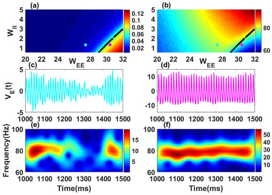 Figure 1. Oscillatory properties of a single stochastic Wilson–Cowan network. Synchronization level (a) and mean frequency (b) of the network are shown in color code in the recurrent inhibitory ( W I I ) vs. recurrent excitatory ( W E E ) weight parameter subspace. Black dot curves in panels (a,b) define the Hopf boundary where the real parts of the rightmost complex conjugate eigenvalues λ = ν ± j ω 0 have ν = 0 . The quasi-cycle regime occurs for ν > 0 and only in the presence of noise (see, e.g., the cyan point in (a) where W E E = 27.4 ); it has weak mean amplitude, i.e., weak synchronization. In the noisy limit cycle regime ν < 0 , limit cycles exist without noise, with amplitude and thus synchronization increasing as the parameters move away to the right of the boundary (representative point in magenta in (a) where W E E = 30.4 ). The amplitude is computed using a long simulation (80 s) of the excitatory activity E ( t ) in Equation (1) with L E E = 0.0 after transients. The two values of the mean frequency in (b) correspond to the high frequency gamma band (30–100 Hz). Fluctuations V E ( t ) are shown in (c) for the quasi-cycle regime and in (d) for the noisy limit cycle. Time-frequency representations of the excitatory fluctuations V E ( t ) are shown for the quasi-cycle in (e) and the noisy limit cycle in (f). Parameters are: α E = 0.1 , α I = 0.2 , β E = 1.0 , β I = 2.0 , W E I = 26.3 , W I E = 32 , W I I = 1.3 , h E = 3.8 , h I = 8.0 , N E = 80,000 and N I = 20,000 for all panels. For this figure and all other figures, numerical simulations were performed using the Euler-Maruyama scheme with a fixed integration step size of d t = 0.05 ms.