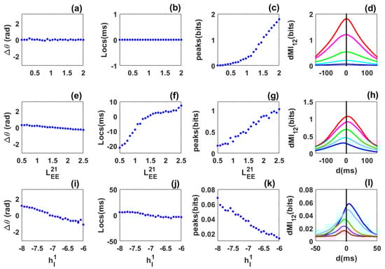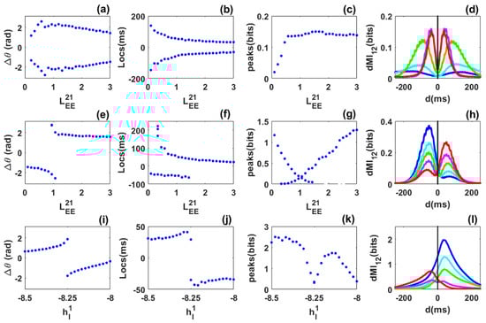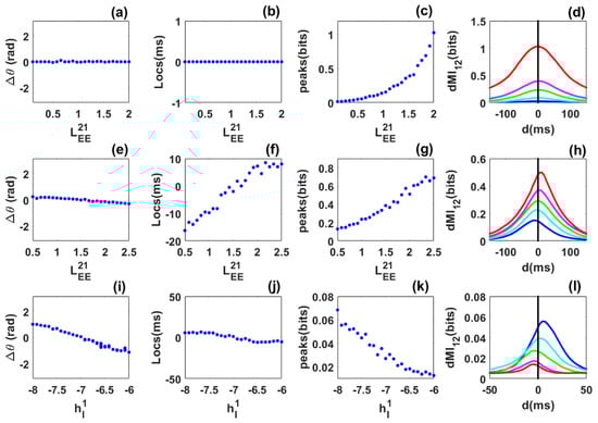 Figure 3. Phase locking and information sharing between networks coupled through long-range excitatory connections in the quasi-cycle regime: SAM analysis. (ad) Symmetric case. (a) Phase difference between the networks as the symmetric long-range excitatory coupling ( L E E 12 = L E E 21 ) varies. The phase-difference value is always near zero. (b) dMI peak location is always at zero showing that there is no preferred direction of information sharing between the networks. (c) dMI peak value increases with coupling. (d) dMI curves for selected values of the long-range excitatory coupling. (eh) Asymmetric case. (e) Phase difference between the networks as the long range excitatory coupling L E E 21 varies while the coupling L E E 12 = 1.5 is fixed. The phase-difference value increases from negative to positive. (f) Peak location changes from negative to positive: there is a preferred direction of information sharing between the networks. (g) Peak value increases with coupling. (h) dMI curves for selected values of the control parameter, showing changes in the location of the single peak. (il) Heterogeneous case. (i) Phase difference as the inhibitory input to the first network h I 1 varies while the inhibitory input to the second network is fixed at h I 2 = 7 . The phase-difference value decreases from positive to negative. (j) Change in the peak location from negative to positive, showing that there is a preferred direction of information sharing between the networks. (k) Peak value decreases as the inhibitory input to the first network increases. (l) dMI curves for selected values of the inhibitory input to the first network. Parameters are the same as in Figure 2.