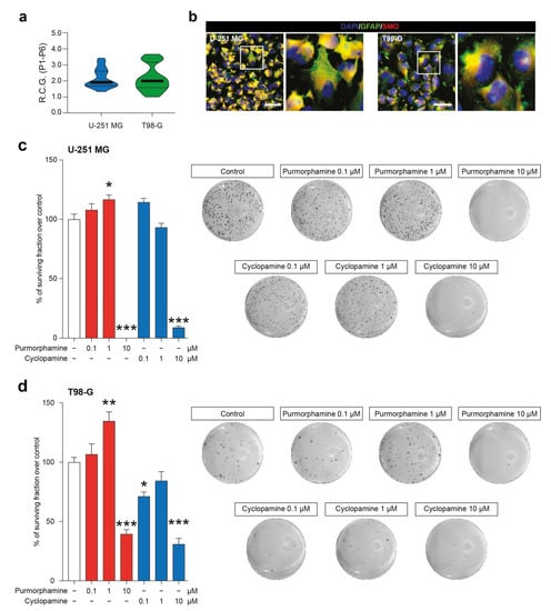 Clonogenic assay was performed as previously described [38]. Briefly, U-251 MG and T98-G cells were plated at 50/cm2 cells per well in triplicate, and were incubated for 8 h, allowing them to attach on the well plate. Then, cells were treated with either vehicle, purmorphamine or cyclopamine at a final concentration of 0.1 µM, 1 µM and 10 µM. Each plate was incubated for 7–10 days, and after colonies were formed, they were fixed with 4% PFA for 15 min and stained with 1% crystal violet for 30 min at room temperature. Colonies which accounted for more than 50 cells were considered as clones. Each assay was repeated in triplicate in three independent experiments. Surviving fractions were calculated as the ratio of colonies counted over the cell plated multiplied for the plating efficiency of the vehicle, according to the protocol of Franken et al. [39].