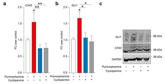 Figure 2. SHH pathway activation is related to CX43 increased expression levels in U-251 MG. (ac) CX43 and GLI1 expression levels (a,b) and representative blots (c) on human U-251 MG cells exposed to 1 µM of purmorphamine and/or 1 µM cyclopamine. Data are mean FC over control ± SEM of n = 3 independent experiments; * p-value < 0.05, ** p-value < 0.01 versus control or between groups; one-way ANOVA with Holm–Šídák post-hoc test. FC: fold change.