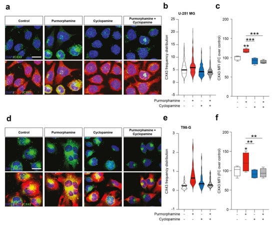 Figure 3. SHH pathway activation increase immunofluorescence intensity of CX43 in human GBM cell lines. (ac) Representative microphotographs of CX43 and GFAP (a), CX43 frequency distribution (b) and quantification of CX43 MFI (c) of control human U-251 MG cells and U-251 MG cells exposed to 1 µM of purmorphamine and/or cyclopamine. (df) Representative pictures of CX43 and GFAP (d), CX43 frequency distribution (e) and quantification of CX43 MFI (f) of control human T98-G cells and T98-G cells exposed to 1 µM of purmorphamine and/or cyclopamine. Data in (b,e) are shown as violin plot of n ≥ 20 cells and data in (c,f) are shown via standard box and whiskers plot of n = 4 independent experiments; * p-value < 0.05, ** p-value < 0.01, *** p-value < 0.001 versus control or between groups; one-way ANOVA with Holm–Šídák post-hoc test. In (a,d) nuclei were counterstained with DAPI; scale bar in (a,d) = 10 μm. MFI.