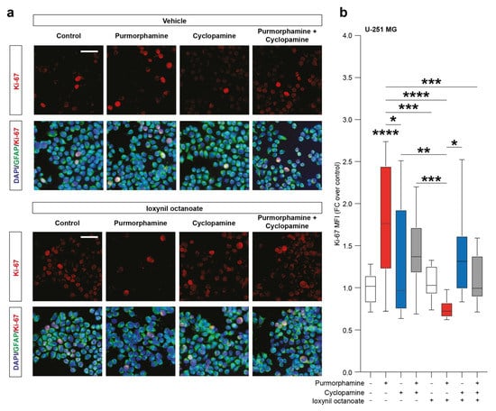 Figure 4. SHH pathway activation increase Ki-67 in U-251 MG cell line. (a,b) Representative microphotographs of Ki-67 and GFAP immunofluorescence analysis (a) and quantification of Ki-67 MFI (b) of control U-251 MG cells and U-251 MG cells exposed to 1 µM of purmorphamine and/or cyclopamine, treated with either vehicle and ioxynil octanoate; nuclei were counterstained with DAPI; scale bar = 20 μm. Data are mean ± SEM of n = 3 independent experiments; * p-value < 0.05 and ** p-value < 0.01, *** p-value < 0.001, **** p-value < 0.0001 versus control or between groups; one-way ANOVA with Holm–Šídák post-hoc test. MFI.